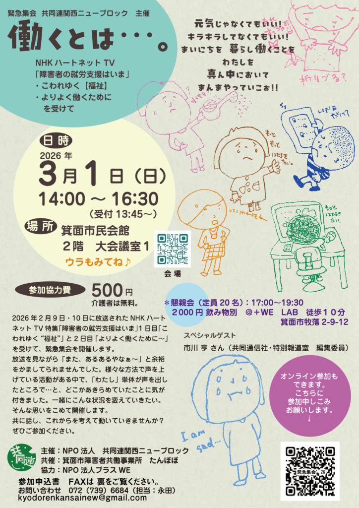 2026年2月9日・10日に放送されたNHKハートネットTV特集「障害者の就労支援はいま」1日目「こわれゆく“福祉”」と2日目「よりよく働くために〜」を受けて、緊急集会を開催します。 放送を見ながら「また、あるあるやなぁ〜」と余裕をかましてられませんでした。様々な方法で声を上げている活動がある中で、「わたし」単体が声を出したところで・・・と、どこかあきらめていたことに気が付きました。一緒にこんな状況を変えていきたい。そんな思いをこめて開催します。
